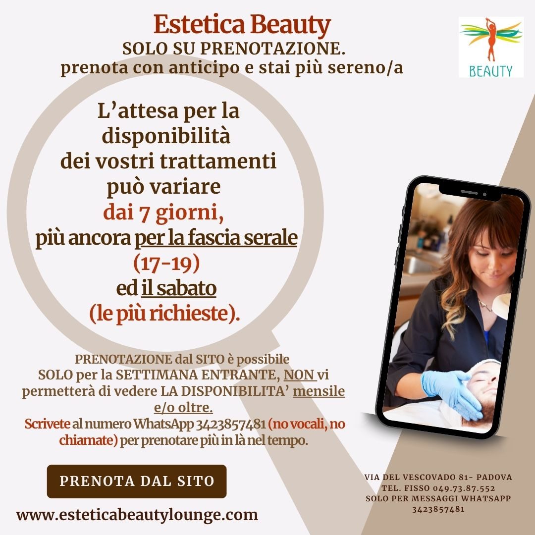 SI RICEVE SOLO ED ESCLUSIVAMENTE SU APPUNTAMENTO GLI APPUNTAMENTI VENGONO PRESI SOLO TELEFONICAMENTE AL 049.73.87.552, DAL SITO WWW.ESTETICABEAUTYLOUNGE.COM O TRAMITE CHAT WHATSAPP AL 342.385.74.81 (NO CHIAMATA E e NO VOCALI) SI CHIEDE IL RISPETTO DELL’ORARIO DI APPUNTAMENTO, DOPO 15 MINUTI Continua…